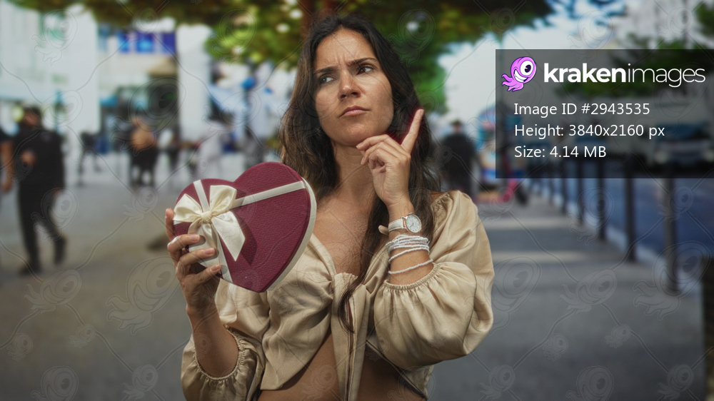 Woman young hispanic holds heart shaped gift box and rests chin on hand on city street amid blurred pedestrians; doubt.