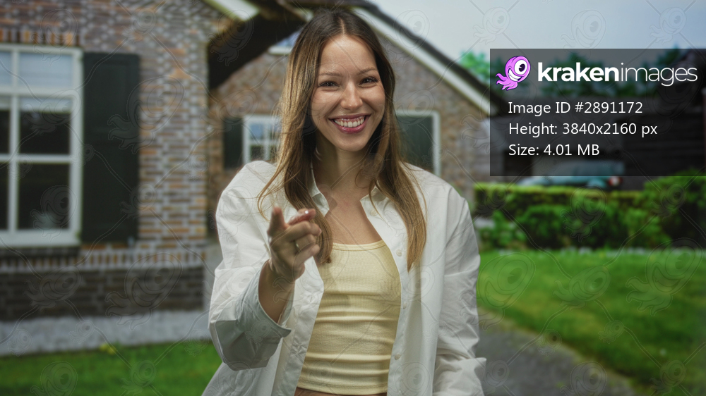 Woman young hispanic points finger to camera at house entrance by green lawn and driveway in front of a building; joyful welcome.