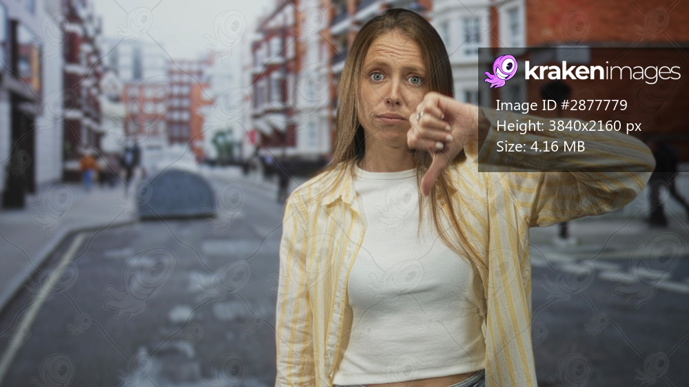 Woman young hispanic showing thumbs down with exposed thumb and neutral face on city street in front of brick buildings; disapproval critique.