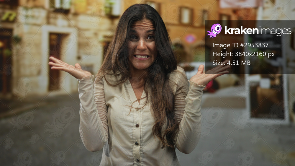 Woman young hispanic shrugging with palms up and hands visible on a narrow city street lined with stone buildings and a parked car; uncertainty.