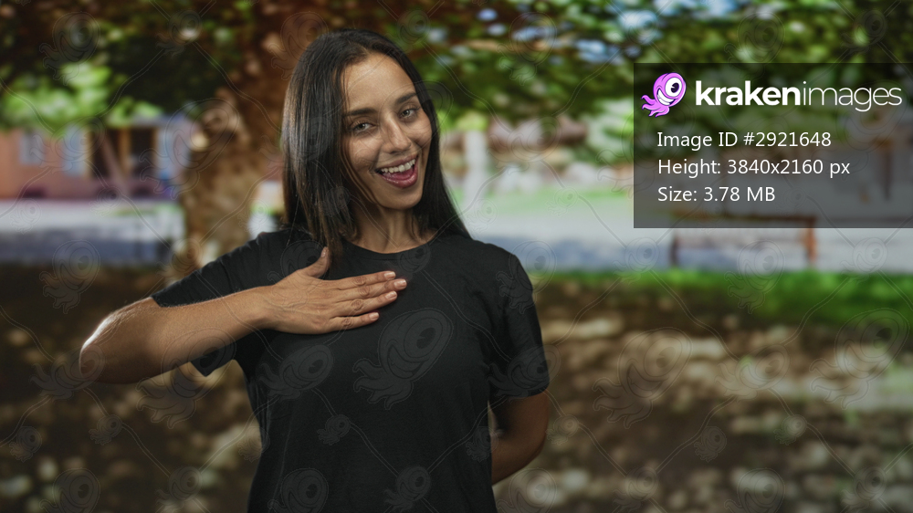 Woman young hispanic smiling with hand on chest, standing under a tree in forest park near a building and bench, green outdoors; gratitude warmth.