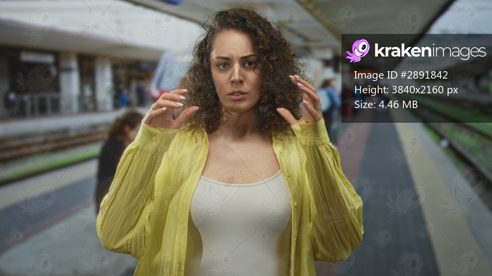 Woman young hispanic standing with chest visible in white tank top and yellow shirt open, facing camera and looking tense on a train station platform; commuter anxiety. - Kraken Images