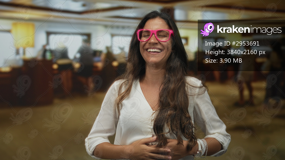 Woman young hispanic wearing bright pink glasses laughing with eyes closed, hand on stomach inside a hotel building lobby with guests at reception; joy comfort. - Kraken Images