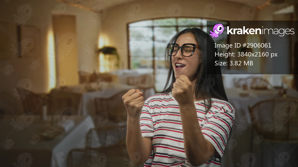 Woman young hispanic wearing glasses and striped shirt pumping fists and singing in restaurant building; celebration.