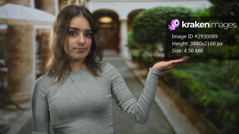 Woman young hispanic wearing gray top and heart necklace holds out hand palm up at a building entrance, presenting empty space; mild skepticism.