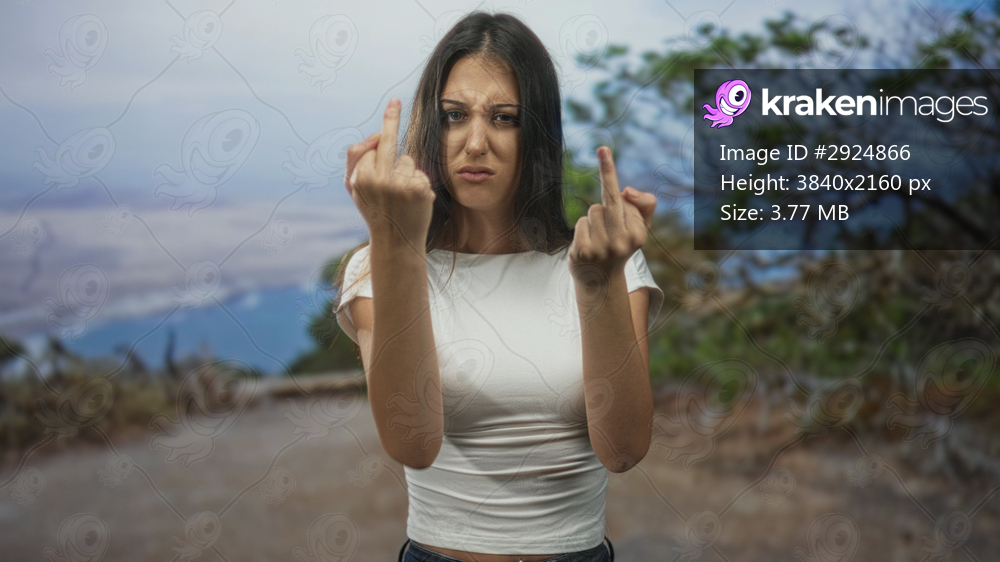 Woman young hispanic wearing white tshirt showing middle fingers and scowling on a forest path near coastline and shrubs; defiance attitude.