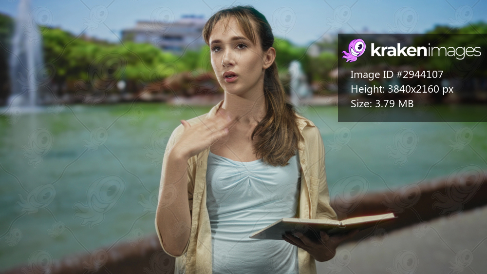 Woman young holding open book, hand raised palm up while reading aloud by building fountain in park; thoughtful reflection.