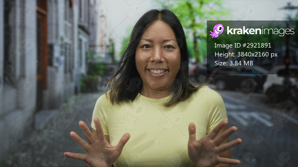Woman young latina smiling with open hands toward camera on street with parked cars and leafy trees, wearing yellow tshirt; friendly joy connection.