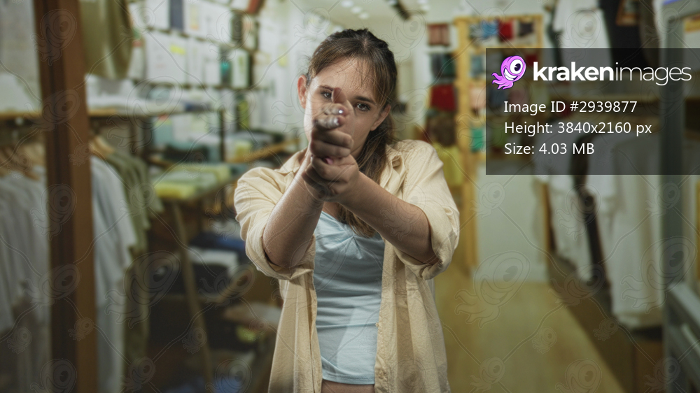 Woman young points finger, bare forearm and midriff visible inside a casual clothing store building with racks of shirts; playful defiance.