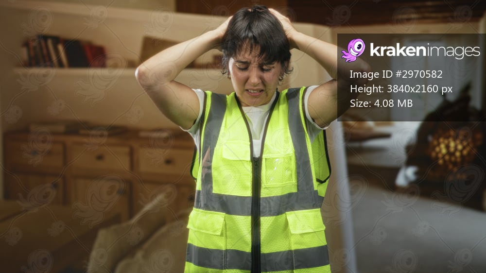 Woman young short hair with hands on head wearing reflective safety vest inside residential building living room; stress resilience.