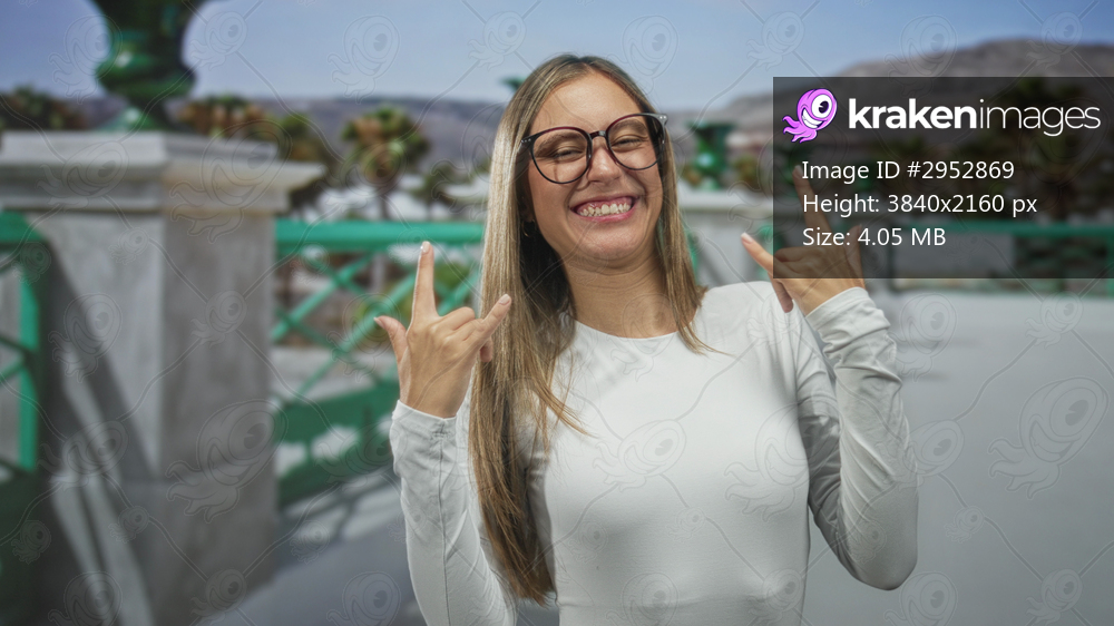 Woman young smiling with glasses making rock horns with hand on seaside promenade street railing in white long sleeve top; joy fun playful.