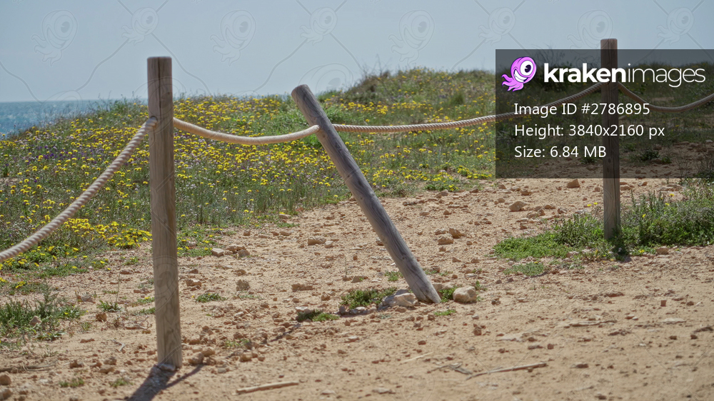 Wooden posts with ropes create a barrier along a sunny sandy path surrounded by wildflowers and green grass at a seaside location under a clear blue sky. - Kraken Images