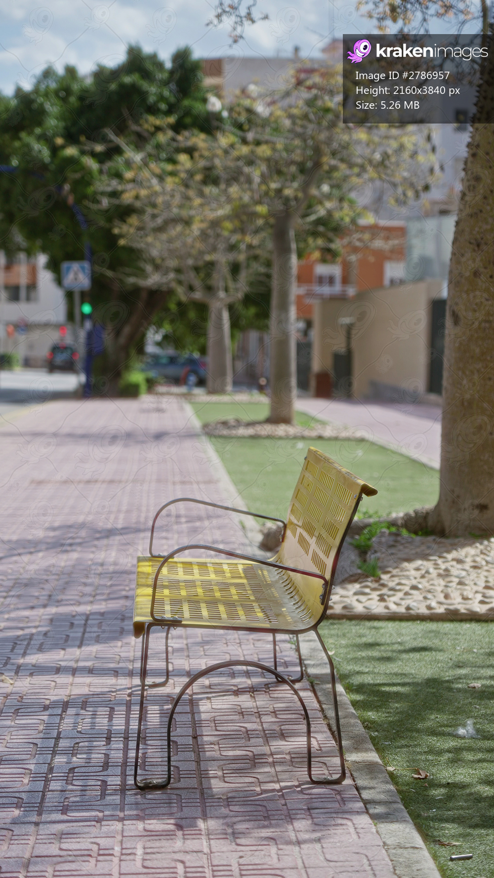 Yellow bench on sunny city sidewalk with trees lining the street and urban buildings in the background, creating a serene atmosphere for outdoor relaxation. - Kraken Images