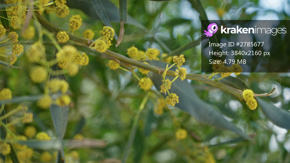 Yellow flowers of acacia dealbata in sunny torrevieja, with green leaves softly blurred in background showing lush mediterranean environment