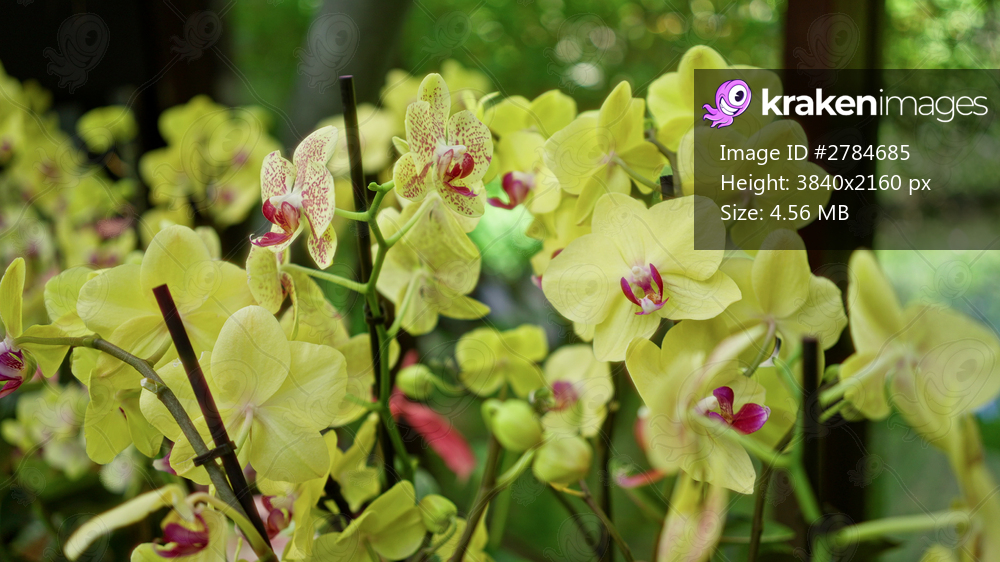 Yellow orchids blooming outdoors in the netherlands, showcasing vibrant phalaenopsis flowers with green foliage and natural sunlight creating a serene garden scene full of life and color. - Kraken Images