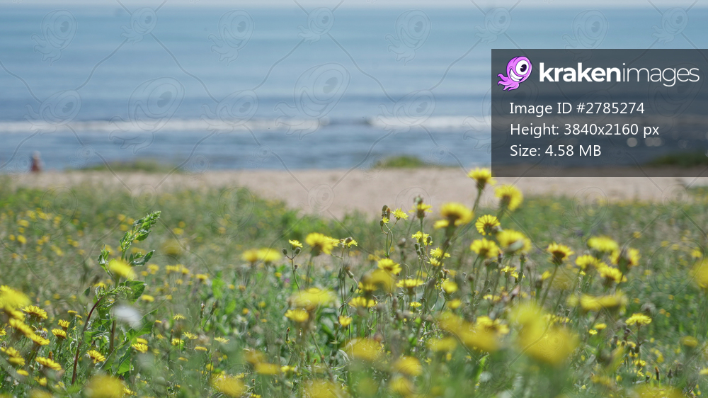 Yellow wildflowers bloom on a green coastal meadow under a bright blue sky by the mediterranean sea, capturing the serene beauty of torrevieja, spain.