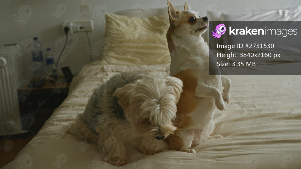 Yorkshire and chihuahua dogs sitting on a cozy bed in a tidy bedroom, showcasing a tranquil home setting.