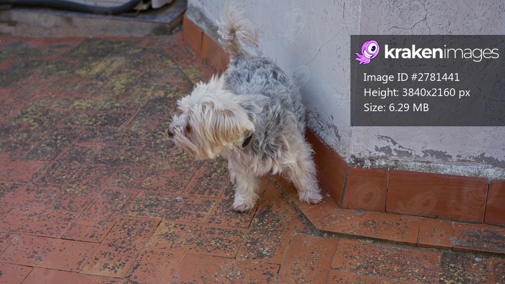 Yorkshire terrier explores outdoor terrace with brick tiles and white wall, highlighting a relaxed sunny day outside urban building.