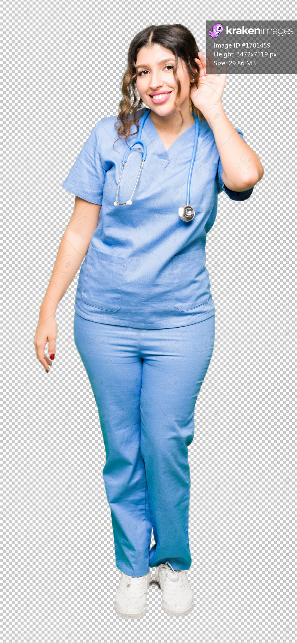 Young adult doctor woman wearing medical uniform smiling with hand over ear listening an hearing to rumor or gossip. Deafness concept.