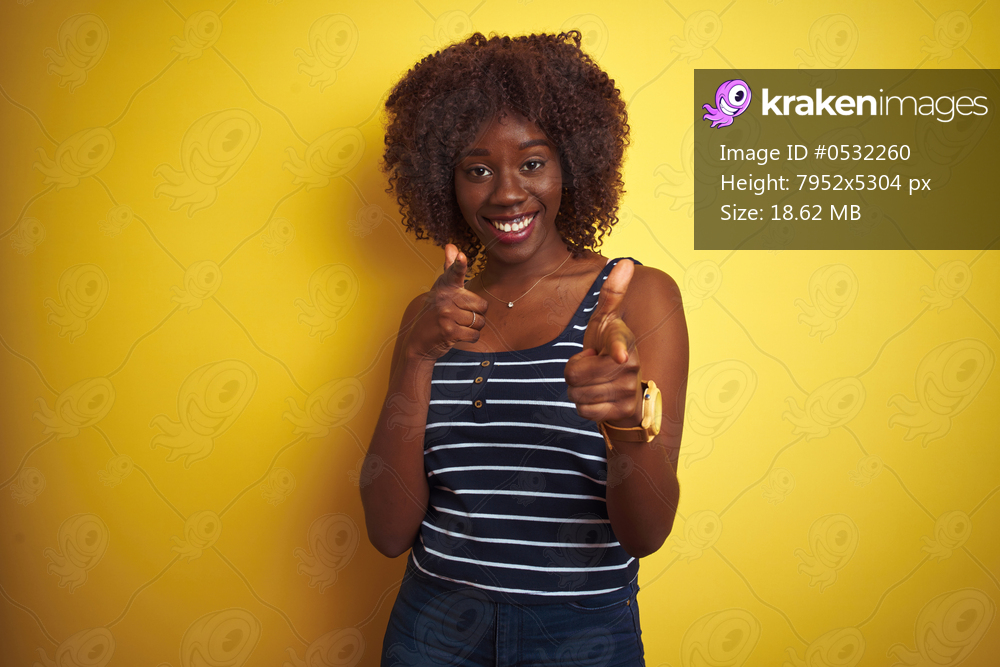 Young african afro woman wearing striped t-shirt over isolated yellow background pointing fingers to camera with happy and funny face. Good energy and vibes. - Kraken Images