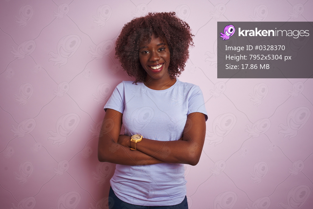 Young african afro woman wearing t-shirt standing over isolated pink background happy face smiling with crossed arms looking at the camera. Positive person. - Kraken Images