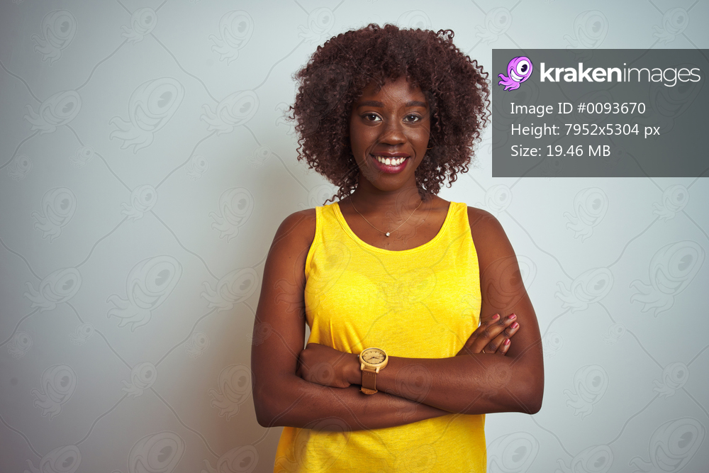 Young african afro woman wearing yellow t-shirt over isolated white background happy face smiling with crossed arms looking at the camera. Positive person. - Kraken Images
