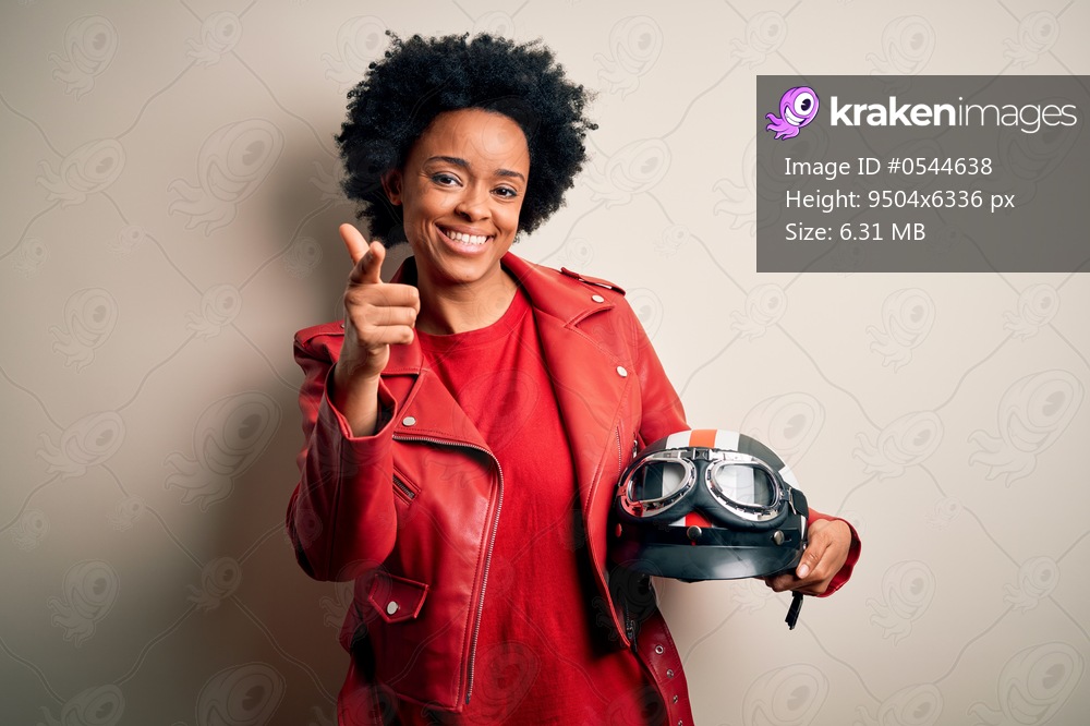 Young African American afro motorcyclist woman with curly hair holding motorcycle helmet pointing fingers to camera with happy and funny face. Good energy and vibes. - Kraken Images