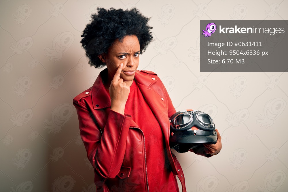 Young African American afro motorcyclist woman with curly hair holding motorcycle helmet Pointing to the eye watching you gesture, suspicious expression - Kraken Images