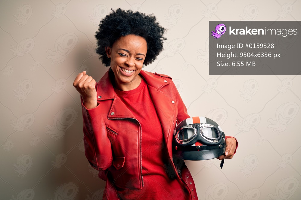 Young African American afro motorcyclist woman with curly hair holding motorcycle helmet very happy and excited doing winner gesture with arms raised, smiling and screaming for success. Celebration concept. - Kraken Images