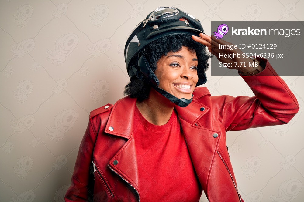 Young African American afro motorcyclist woman with curly hair wearing motorcycle helmet very happy and smiling looking far away with hand over head. Searching concept. - Kraken Images