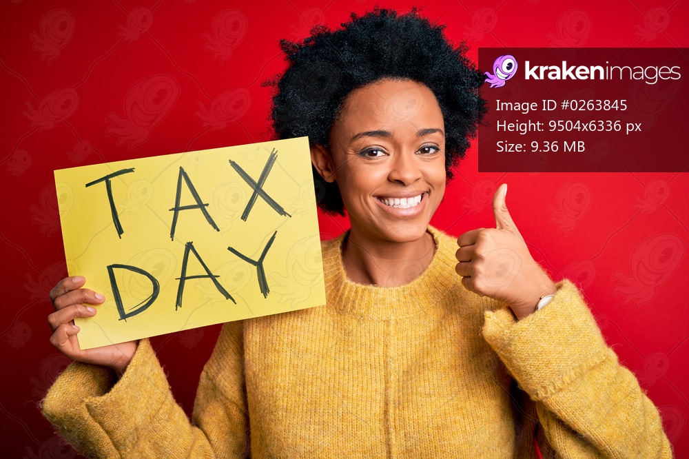 Young African American afro woman with curly hair holding paper with tax day message happy with big smile doing ok sign, thumb up with fingers, excellent sign - Kraken Images