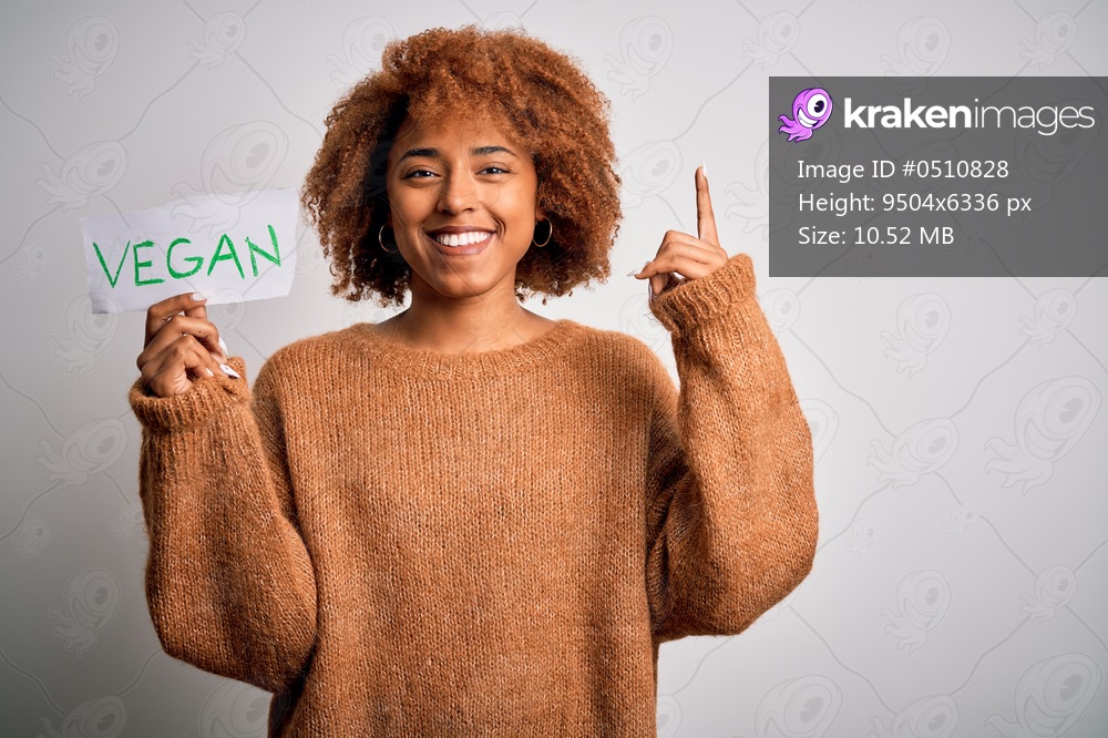 Young African American afro woman with curly hair holding paper with vegan message surprised with an idea or question pointing finger with happy face, number one - Kraken Images
