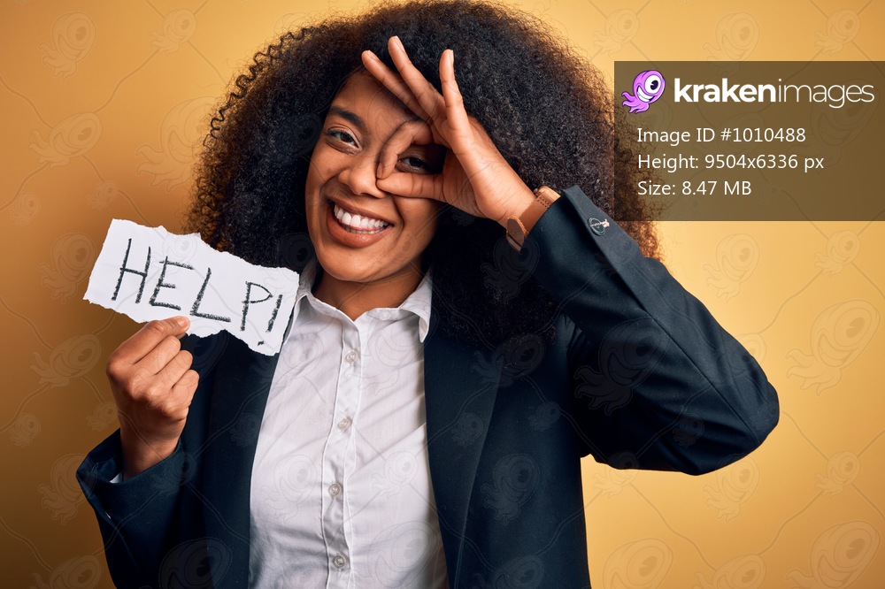 Young african american business woman with afro hair holding help paper for work stress with happy face smiling doing ok sign with hand on eye looking through fingers - Kraken Images