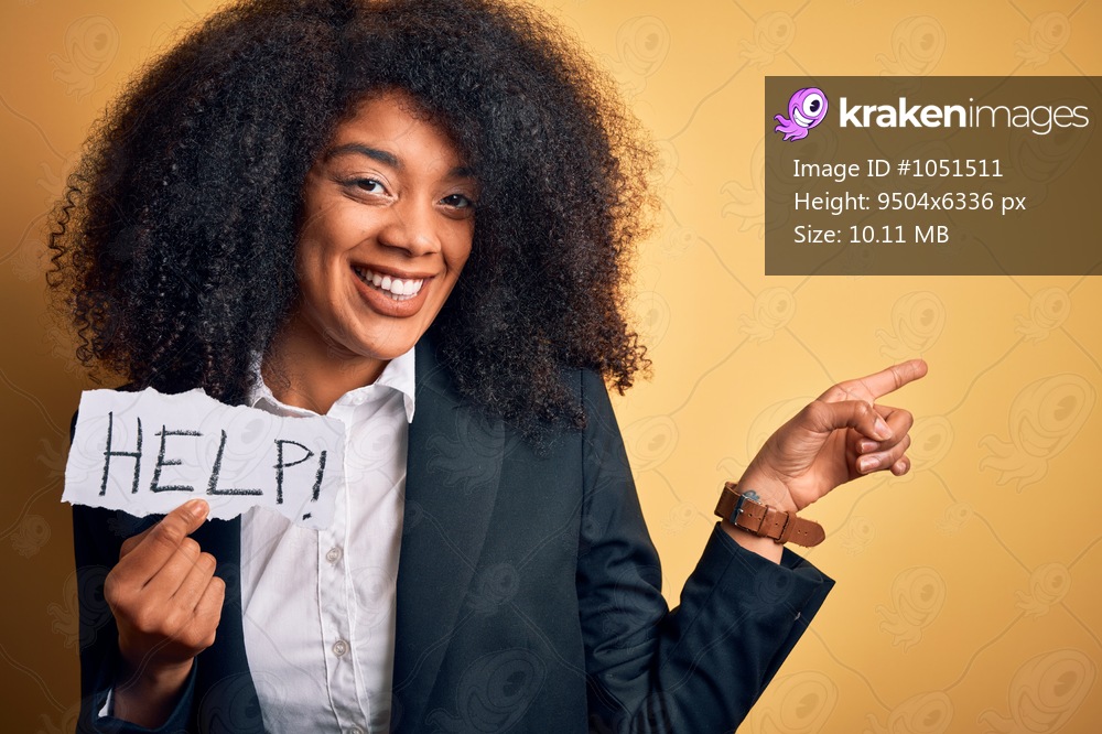 Young african american business woman with afro hair holding help paper for work stress very happy pointing with hand and finger to the side