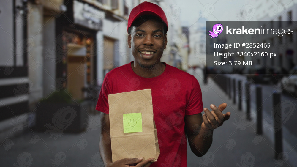 Young african american delivery man smiling while holding a paper bag on a street; confident service.