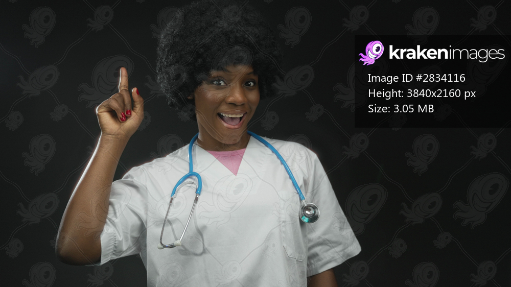 Young african american doctor with stethoscope points finger upward in studio setting; confidence guidance.