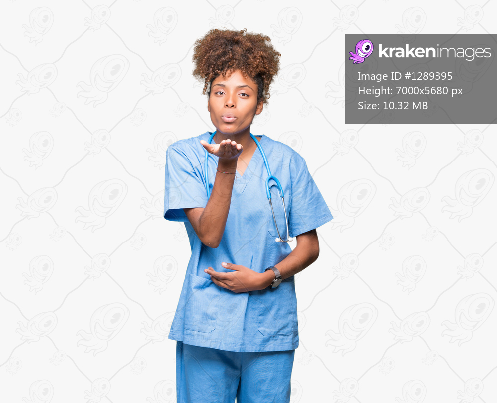 Young african american doctor woman over isolated background looking at the camera blowing a kiss with hand on air being lovely and sexy. Love expression. - Kraken Images