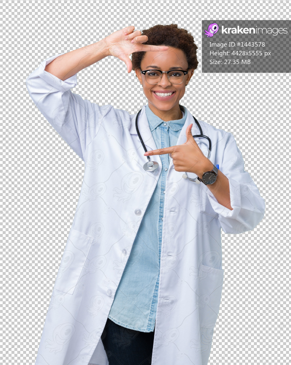 Young african american doctor woman wearing medical coat over isolated background smiling making frame with hands and fingers with happy face. Creativity and photography concept. - Kraken Images