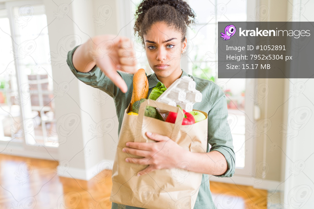 Young african american girl holding paper bag of groceries from supermarket with angry face, negative sign showing dislike with thumbs down, rejection concept - Kraken Images