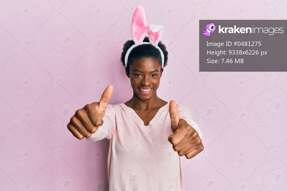 Young african american girl wearing cute easter bunny ears approving doing positive gesture with hand, thumbs up smiling and happy for success. winner gesture. - Kraken Images