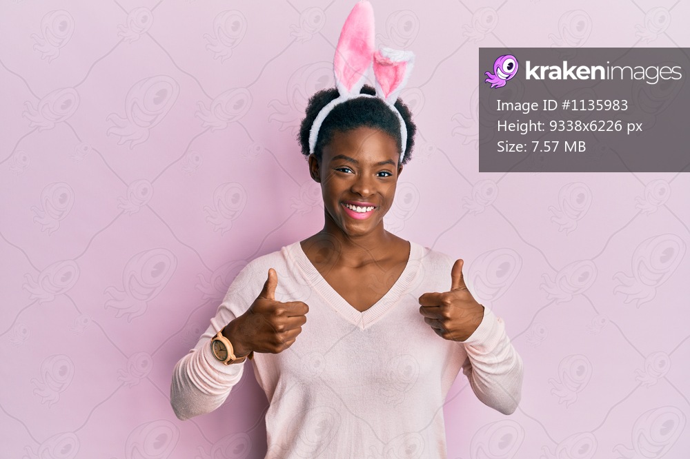 Young african american girl wearing cute easter bunny ears success sign doing positive gesture with hand, thumbs up smiling and happy. cheerful expression and winner gesture. - Kraken Images