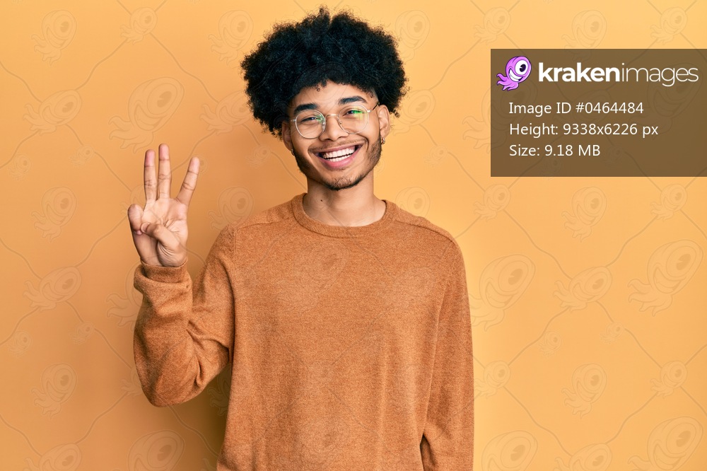 Young african american man with afro hair wearing casual winter sweater showing and pointing up with fingers number three while smiling confident and happy. - Kraken Images
