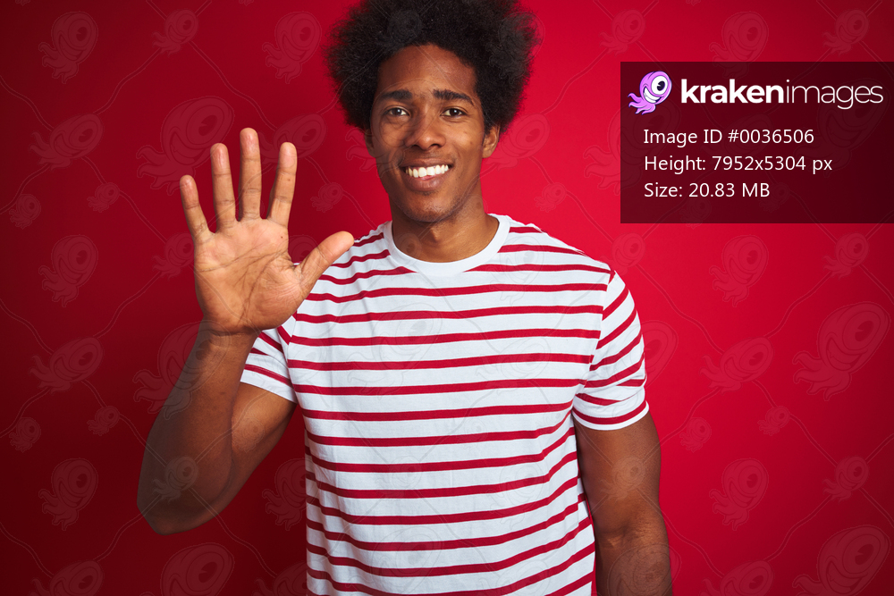 Young african american man with afro hair wearing striped t-shirt over isolated red background showing and pointing up with fingers number five while smiling confident and happy. - Kraken Images