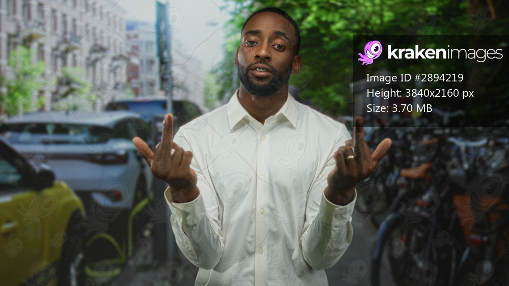 Young african american man with beard and eyes closed standing on a city street near bicycles and cars, wearing a white shirt; contemplation.