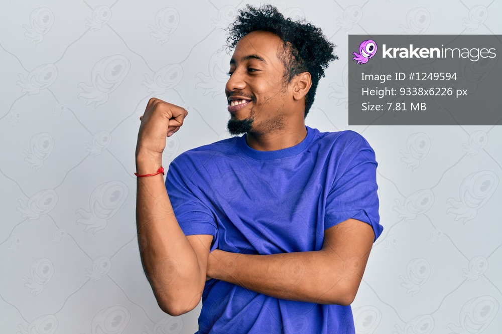 Young african american man with beard wearing casual blue t shirt pointing thumb up to the side smiling happy with open mouth