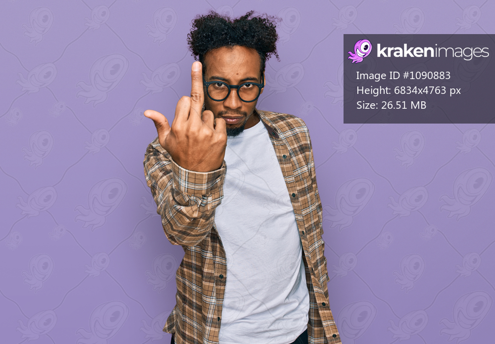 Young african american man with beard wearing casual clothes and glasses showing middle finger, impolite and rude fuck off expression