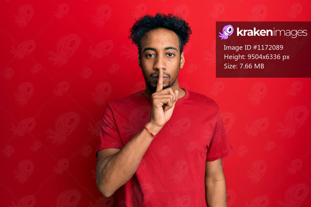 Young african american man with beard wearing casual red t shirt asking to be quiet with finger on lips. silence and secret concept.