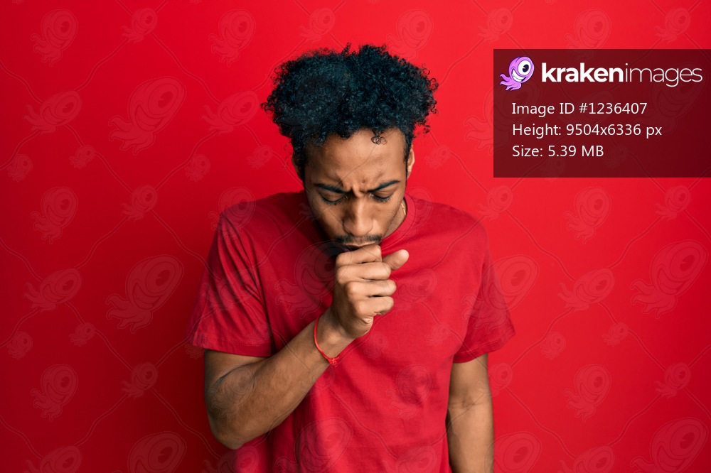 Young african american man with beard wearing casual red t shirt feeling unwell and coughing as symptom for cold or bronchitis. health care concept.