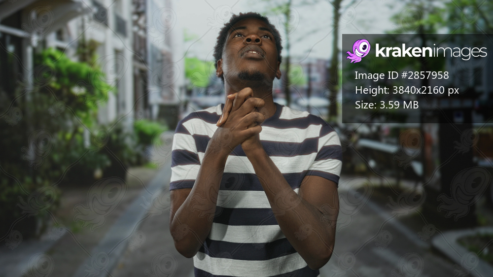 Young african american man with clasped hands praying on green city street lined with trees under daylight; faith hope devotion serenity.