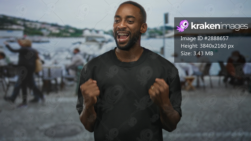 Young african american man with clenched fists celebrating on a restaurant terrace by the waterfront; celebration joy.